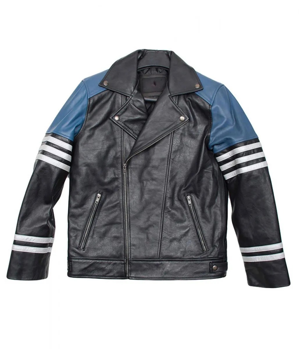 Mens Classic Black and Blue Striped Leather Biker Jacket