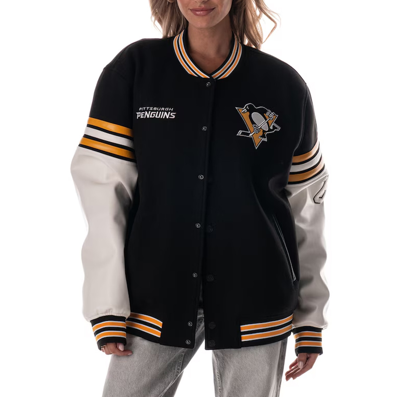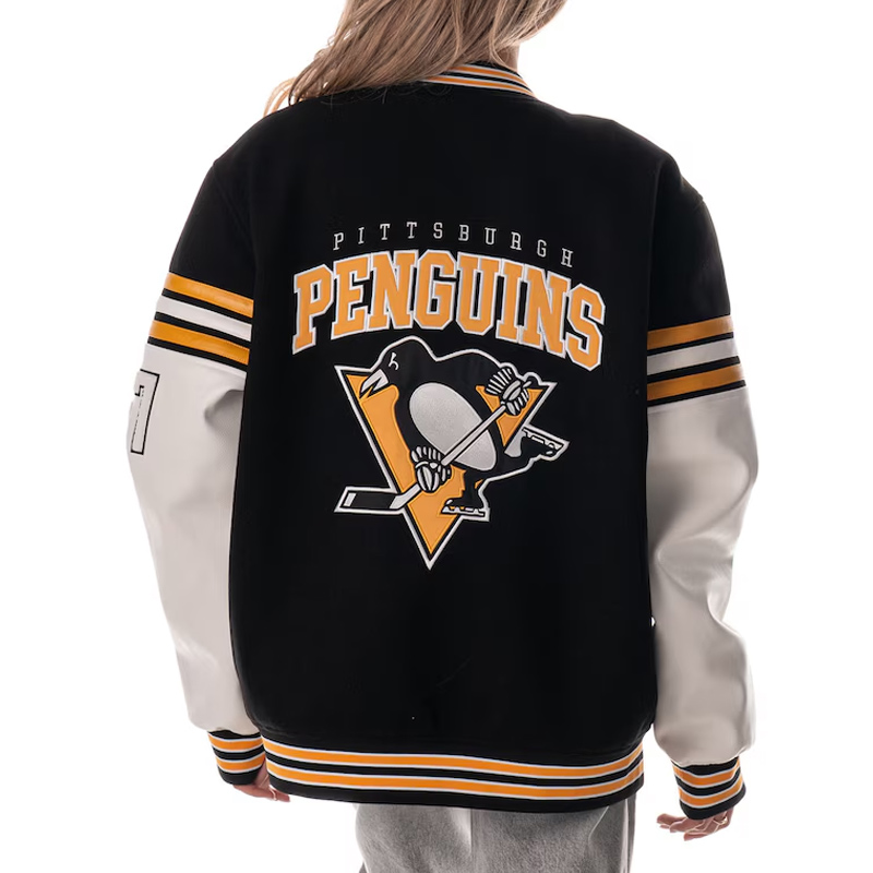 The Pittsburgh Penguins Drop Shoulder Varsity Wool/Leather Jacket reflects the championship tradition and proud history of the Penguins franchise. Inspired by classic varsity design and NHL culture, this jacket blends timeless sports heritage with a relaxed drop shoulder silhouette for modern appeal. Its bold team identity makes it perfect for loyal supporters who value both style and legacy. The Pittsburgh Penguins Drop Shoulder Varsity Wool/Leather Jacket stands as a statement piece celebrating hockey passion and iconic team pride.