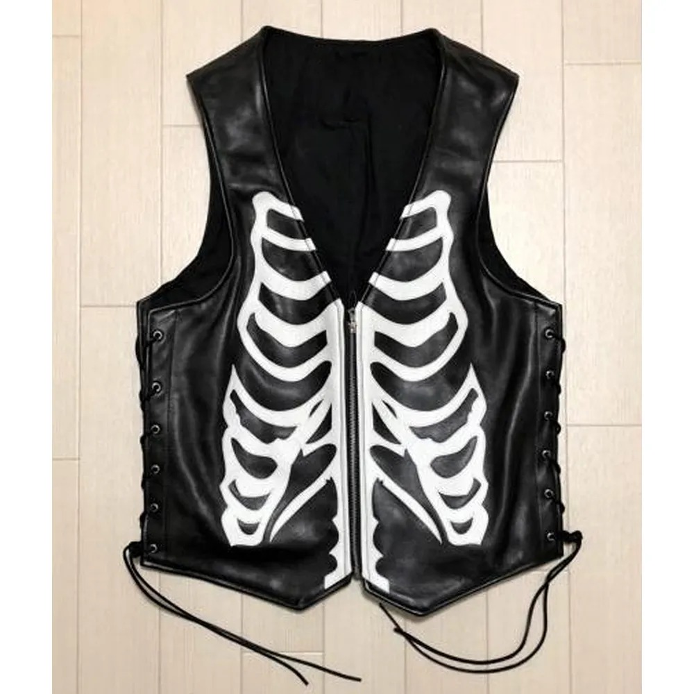 Skeleton Print Black Leather Vest