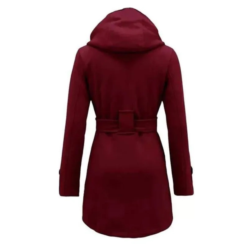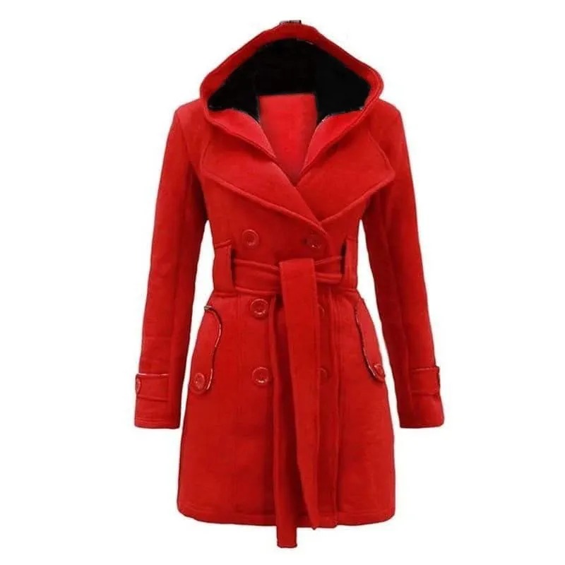 Women Red Double Breasted Belted Wool Coat